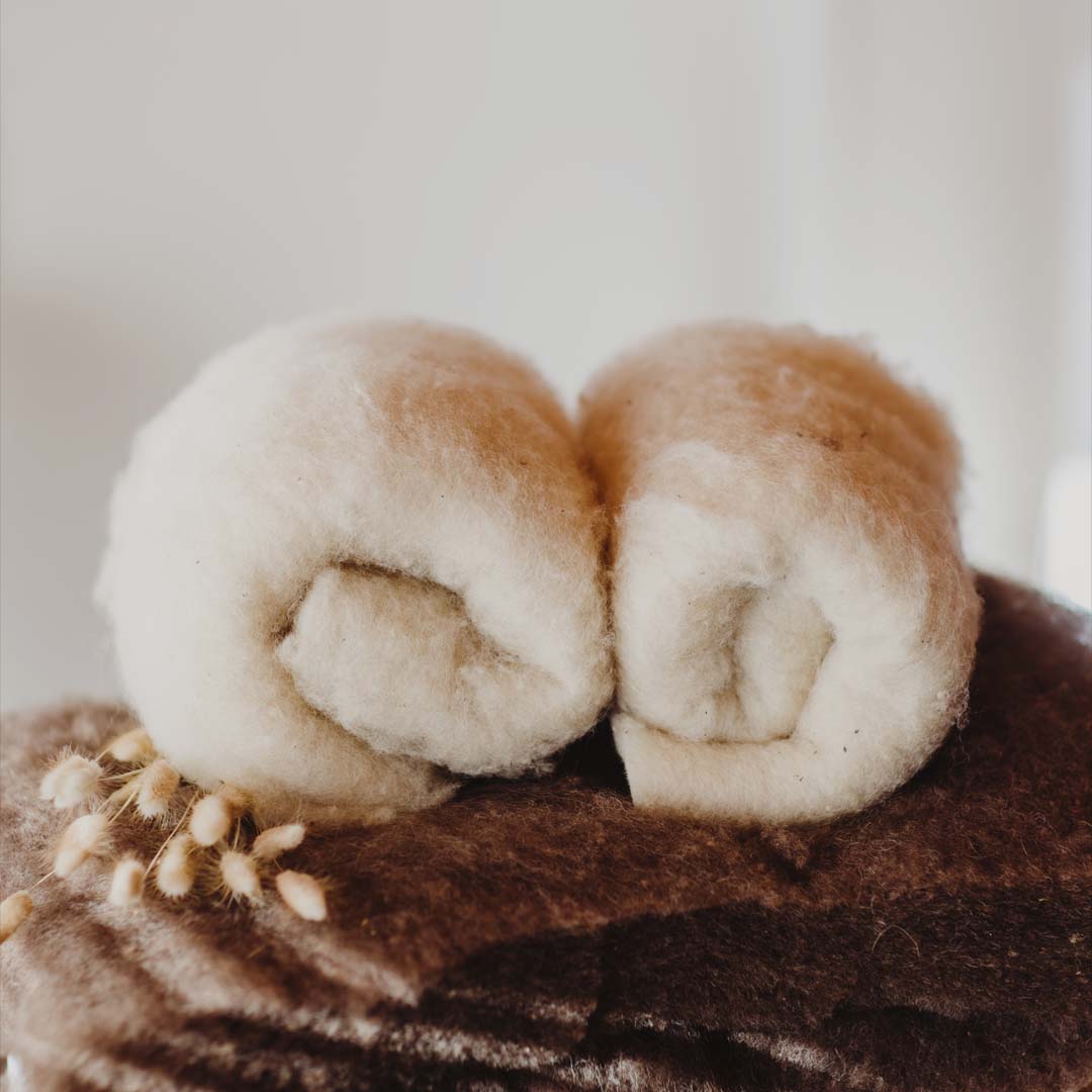 Villa on karstattu patjoiksi, mutta muuten se on käsittelemätöntä. Lampaan rasva, eli lanoliini, on villassa tallella. Se onkin juuri tuotteen hoitava ominaisuus. Ottaessasi patjat käteesi, huomaat mistä puhun!