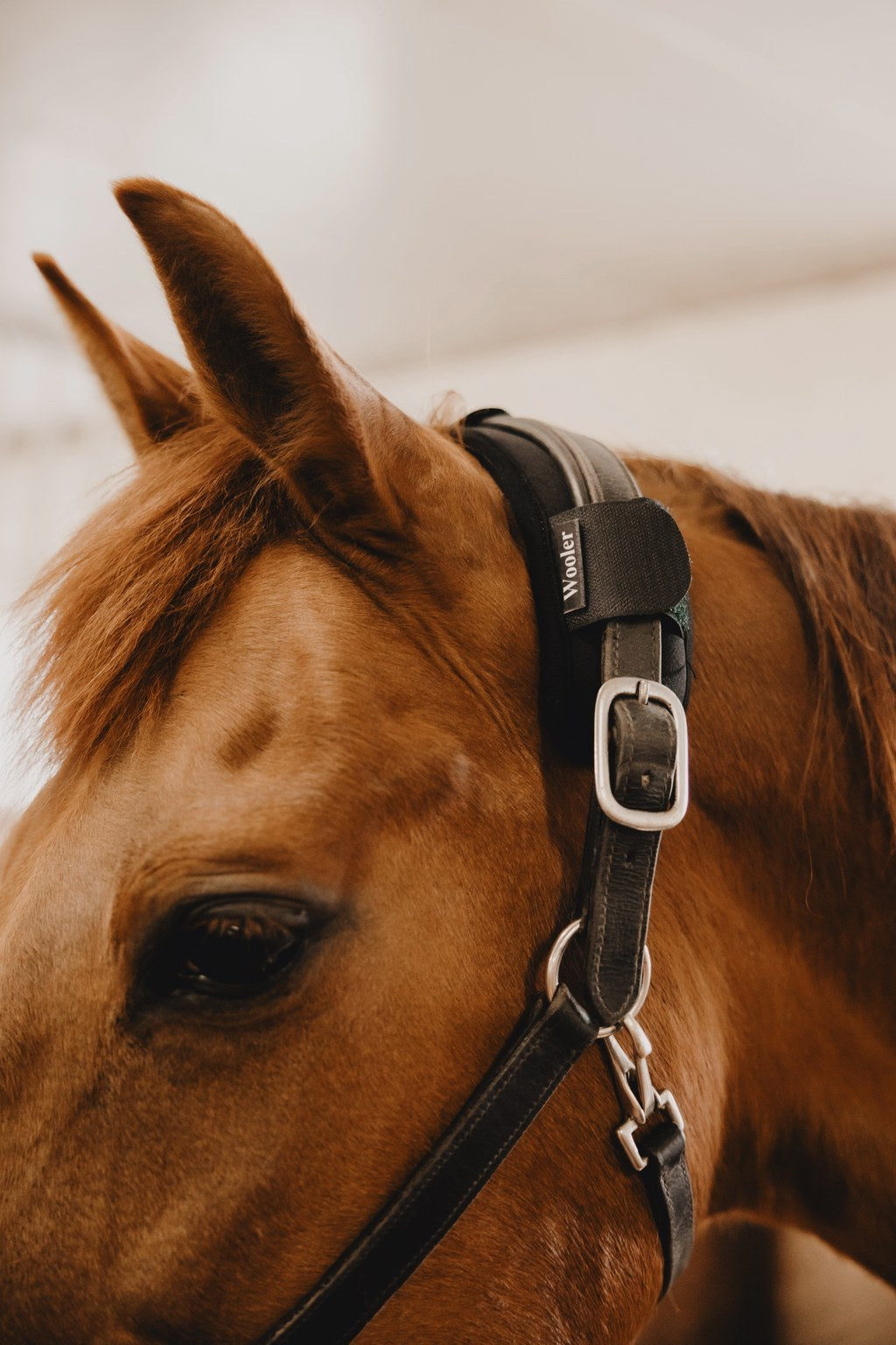 Neopreenisen niskasuojan voi asentaa riimun niskahihnan alle tarrakiinnityksella. Niskaa vasten asettuvan lampaanvillan lämpöominaisuudet yhdessä lanoliinin kanssa hellivät hevosesi niskaa ulkona tuulelta. Neopreeni ei kastu helposti, joten voit käyttää tuotetta myös pienellä sateella.